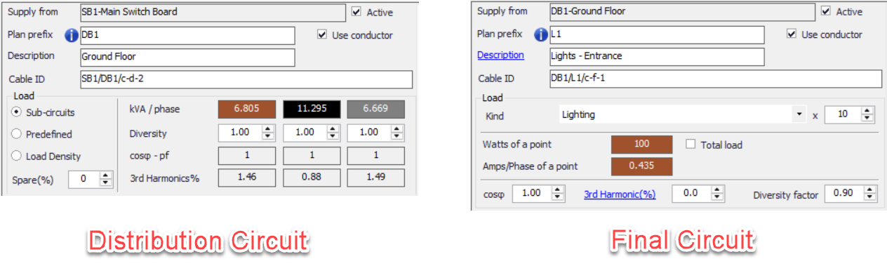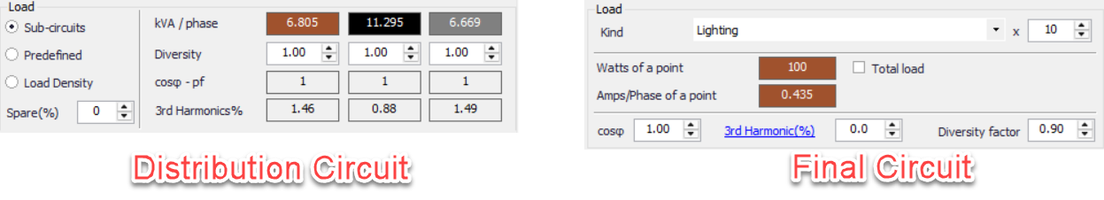 Load section of a final circuit has two data fields; Kind and x. Kind defines the circuit type and will affect various calculations, for example, diversity calculations. Also, some of the kinds have specific checks and additional settings. So, it is important to select an appropriate circuit type depending on the load characteristics. A brief description of circuit kinds having special features are listed below: