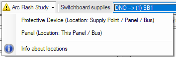 - Switchboard supplies drop-down list lists all supplies available to the selected switchboard. This option is available only for switchboards fed by multiple sources. Using the drop-down list, user can switch between each source available. Calculations related with the selected source will be displayed.