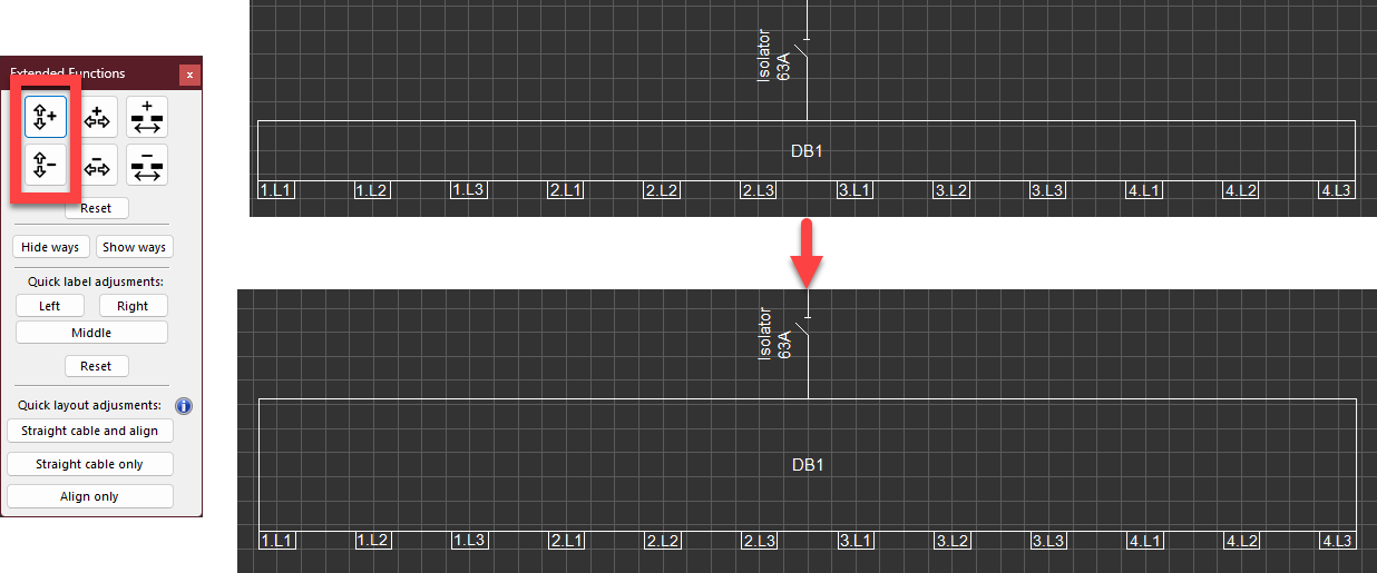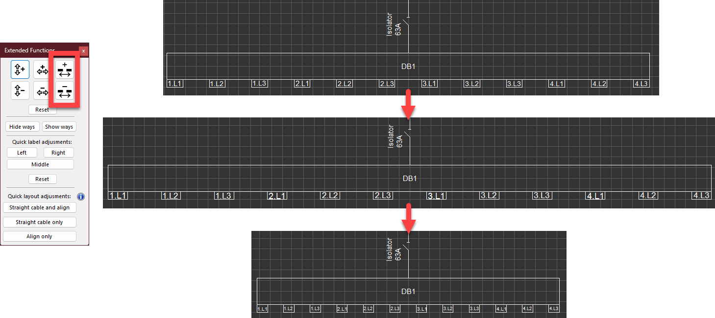 - Increase/decrease board width on schematic: These buttons will increase or decrease the width of the box representing a board. Button with + sign will increase width where button with - sign will decrease width. It must be noted that these buttons will not make any changes to the spacing between ways.
