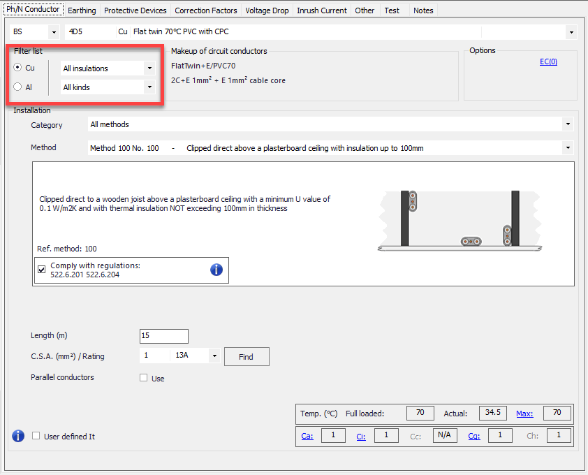 The last part of the Ph/N Conductor Tab is related with the physical details about the cable or conductor which includes the length, the cross section, etc. When a new circuit is inserted, the default conductors are set to 4D1, default installation method is set to Method B No.59, default length is set to 15 metres, and the default cross section is set to 1mm2.